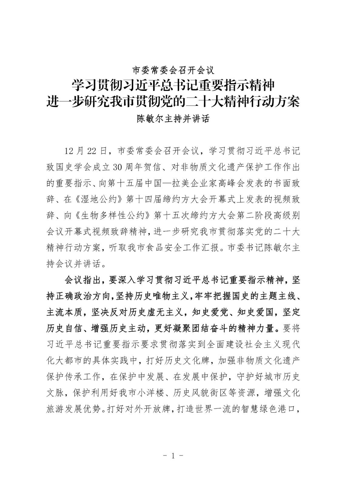 市委常委会召开会议学习贯彻习近平总书记重要指示精神进一步研究我市贯彻党的二十大精神行动方案